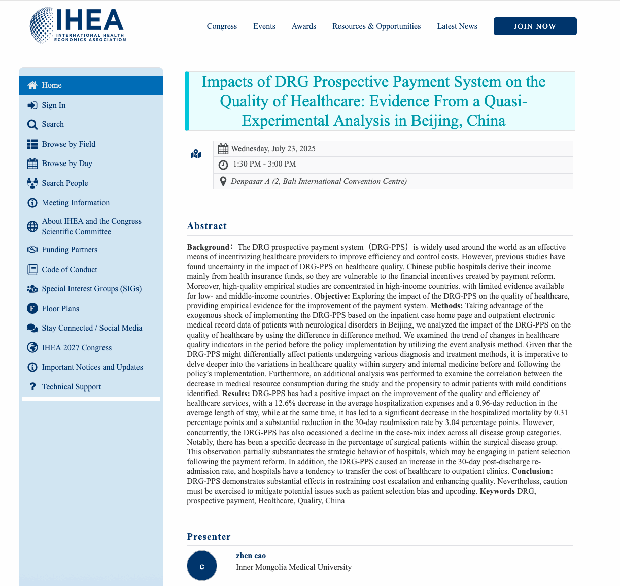 世界卫生经济大会是由国际卫生经济学协会(International Health Economics Association, IHEA)主办的全球性学术会议,自1996年以来每两年举办一次,是全球卫生经济学专家交流最新方法学进展、分享最新研究成果并探讨研究成果对卫生政策与实践影响的最具影响力的国际会议。本届世界卫生经济大会聚焦“健康的评价、分布和经济影响”“卫生系统之外的健康”“卫生服务需求与利用”等7个主要议题。我院教师曹珍在“卫生服务筹资与支出”专题会议中作了题为“Impacts of DRG Prospective Payment System on the Quality of Healthcare Evidence From a Quasi-Experimental Analysis in Beijing, China”的报告,报告从医疗服务质量角度探讨了我国医保基金支付方式改革的初期成效和现存问题。国际知名学者Sophie Witter充分肯定了该研究的意义,与会学者对研究方法和结果的可推广性展开了深入探讨。
