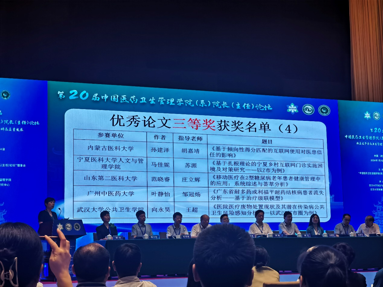 本次论坛同时公布了“人卫杯”全国医药卫生管理专业本科生毕业论文(设计)竞赛获奖名单并为获奖者颁奖。今年共有来自全国62所高校172篇论文参赛,通过专家盲审评选出一等奖10名,二等奖15名,三等奖20名。内蒙古医科大学卫生管理学院2024届公共事业管理专业本科生孙建泽凭借毕业论文“基于倾向性得分匹配的互联网使用对医患信任的影响”(指导教师:胡嘉靖)获得“人卫杯”第十三届全国医药卫生管理专业本科生毕业论文(设计)竞赛优秀论文三等奖。