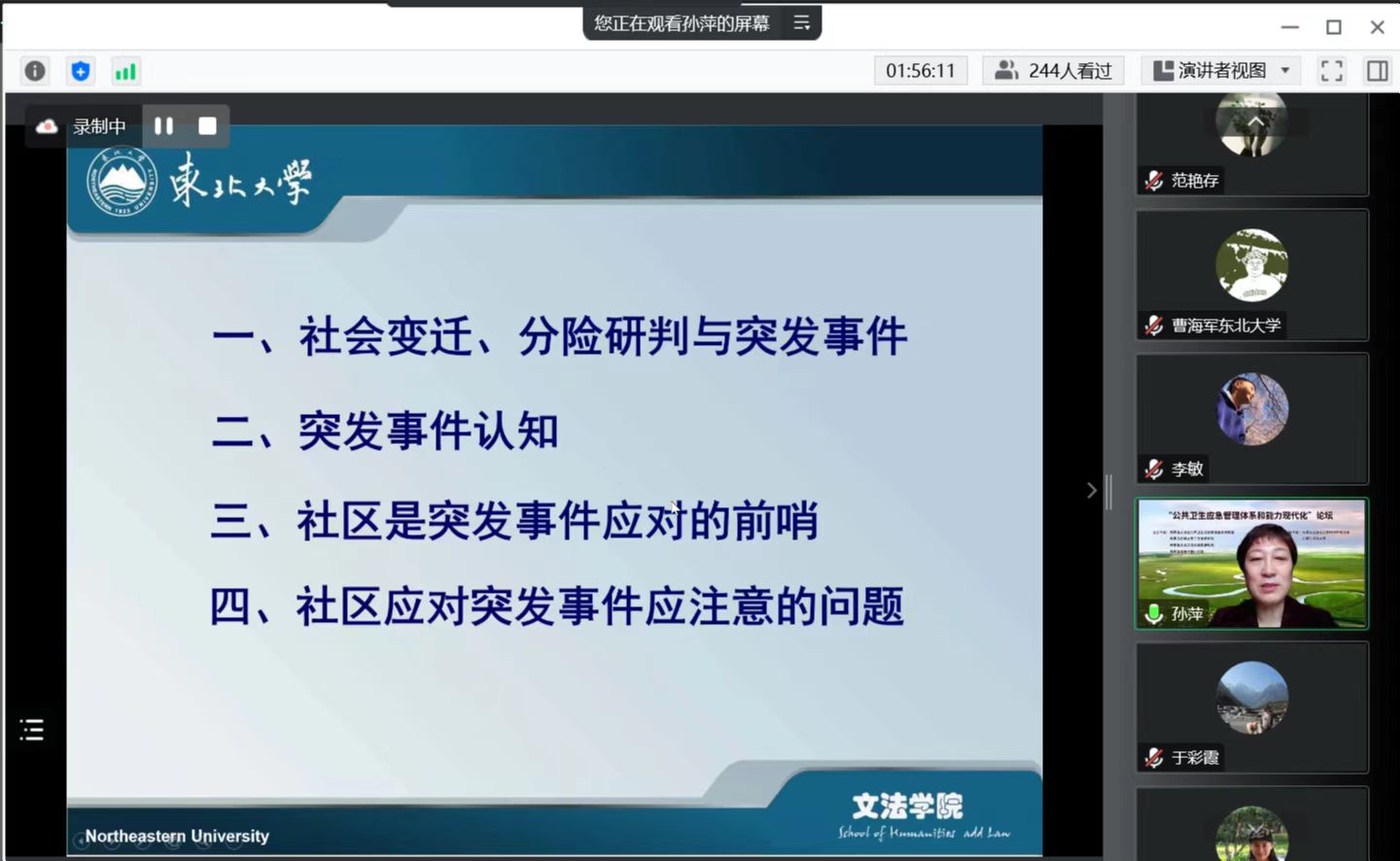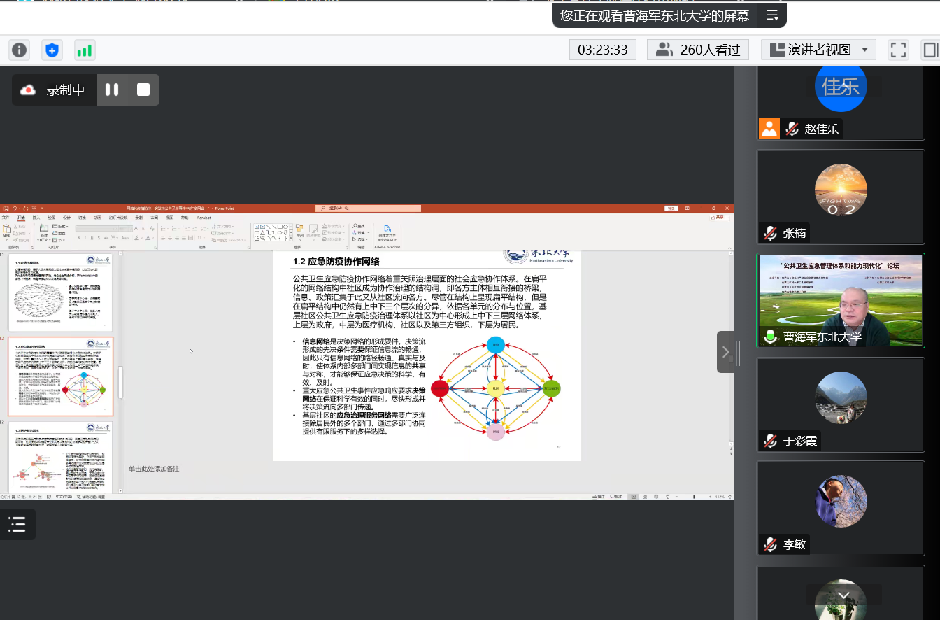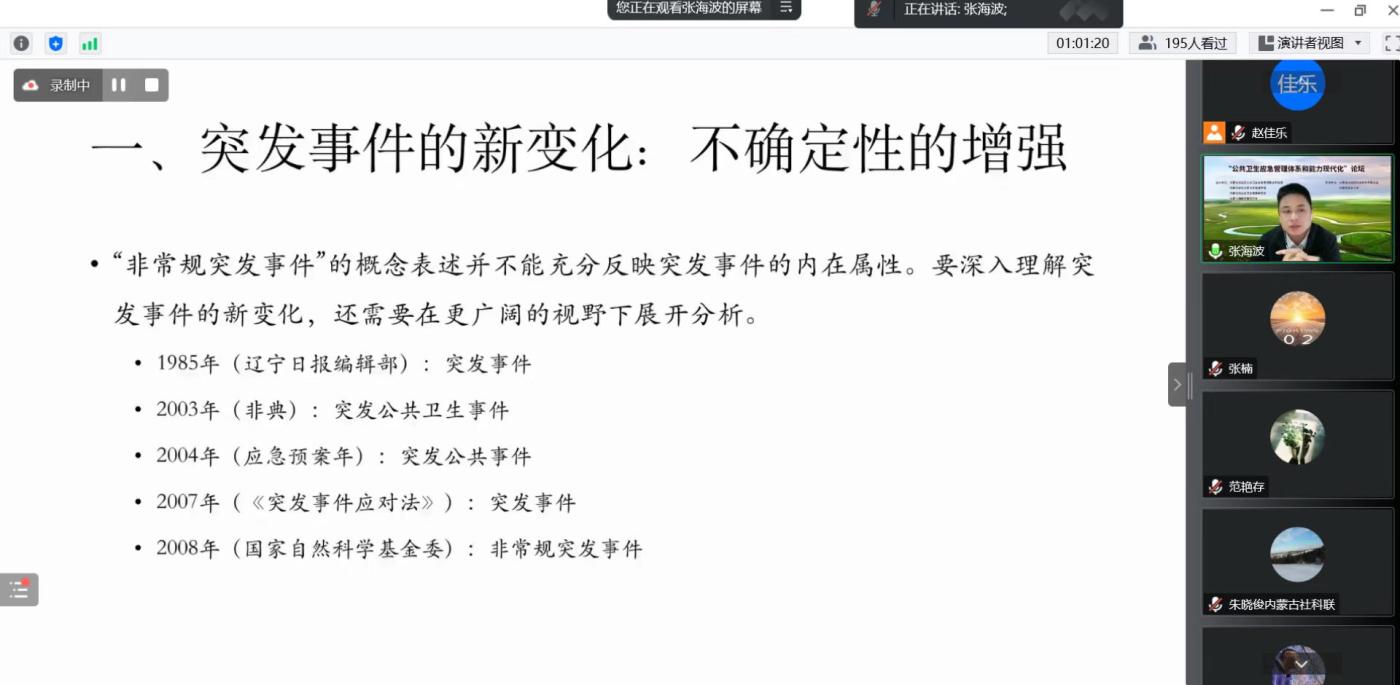论坛由内蒙古自治区公共卫生应急管理重点实验室主任张楠教授主持。内蒙古自治区社科联党组成员、副主席朱晓俊,内蒙古医科大学卫生管理学院院长、内蒙古自治区卫生政策研究所所长、内蒙古健康政策研究会会长范艳存出席论坛并致辞。论坛邀请南京大学政府管理学院副院长、社会风险与公共危机管理研究中心执行主任张海波教授,东北大学文法学院教授、教育部高等学校公共管理类学科专业教学指导委员会副主任委员孙萍教授,东北大学国家治理研究院执行院长、文法学院行政管理系系主任曹海军教授分别做了题为《中国第四代应急管理体系:逻辑与框架》《社区治理中风险研判与突发事件应对》《网络化疫情防控:突发性公共卫生事件中的“多网合一”》的专题讲座。