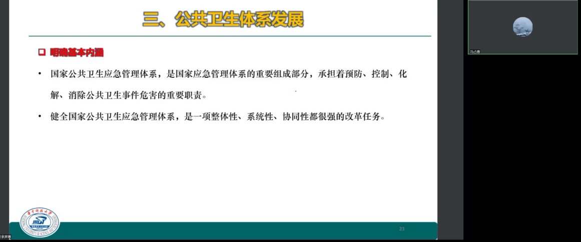 占春教授在此次讲座中首先介绍了公共卫生的概念及其在新时期的特征;其次回顾了我国在健康中国建设的历程,以及公共卫生在健康中国建设中所发挥的主导性作用;最后梳理了我国公共卫生体系的发展历程,并强调了公共卫生应急体系建设的重要意义。