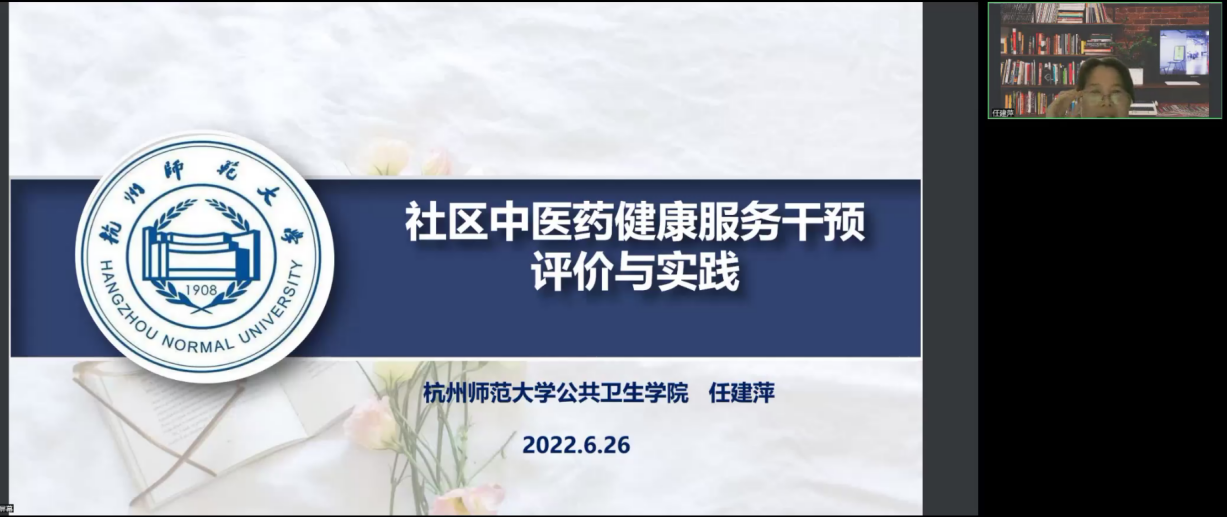 2022年6月26日晚,我院特邀杭州师范大学公共卫生学院健康管理系主任任建萍为我院全体师生以及内蒙古健康政策研究会会员开展线上讲座。任教授开展了题为“社区中医药健康服务干预评价与实践”的讲座,卫生管理学院健康管理系主任张媛主持。