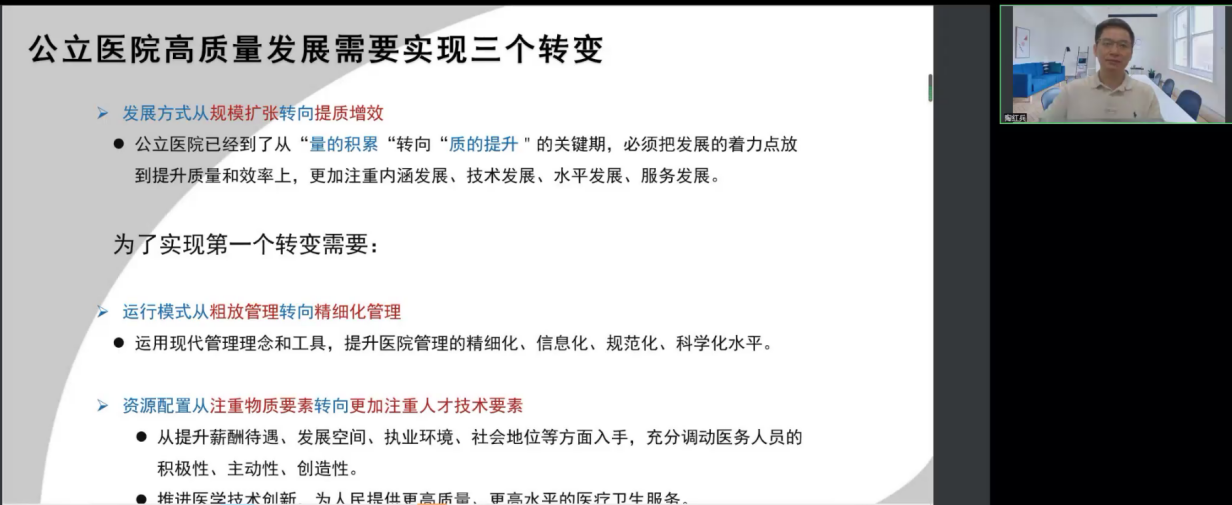 陶教授在此次讲座中首先讲解了提高医疗服务效率与质量的影响因素,其次分享了其中的几个关键问题,最后详细分析了提升医疗服务效率与质量的策略。其中,陶教授从发展方式、运行模式、资源配置三个方面的转变分析了公立医院高质量发展的方向。
