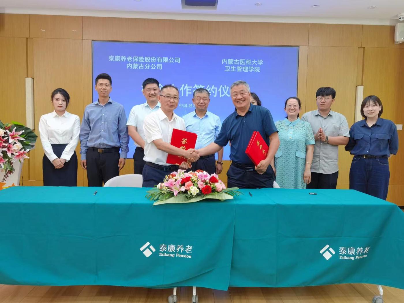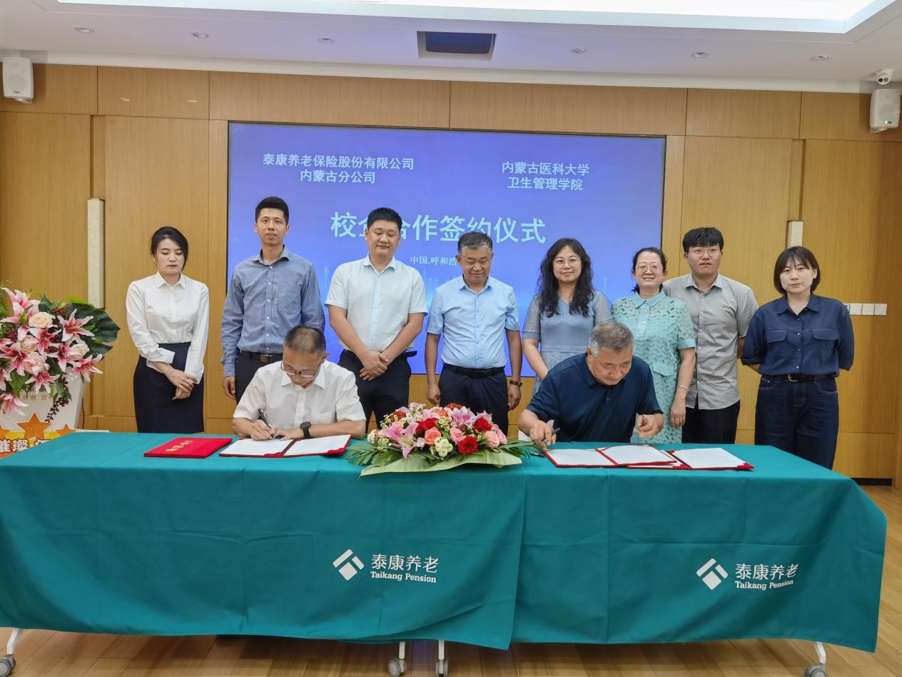 领导讲话后,进行卫生管理学院与泰康养老保险股份有限公司内蒙古分公司院企合作签约仪式。双方领导共同签署了《院企社会实践合作协议书》、《产学研合作协议书》。