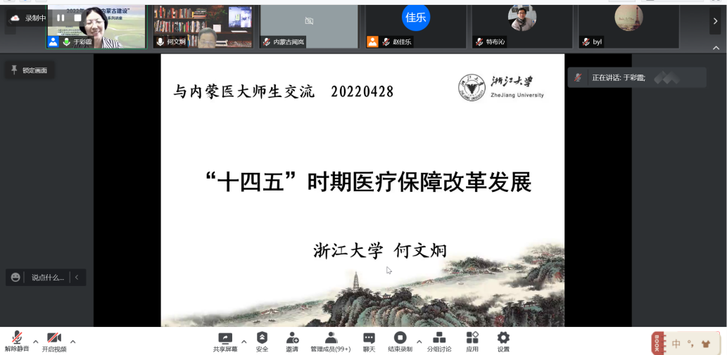 2022年4月28日晚,我院特邀浙江大学何文炯教授为我院全体师生以及内蒙古健康政策研究会会员开展线上讲座。何教授开展了题为《“十四五”时期医疗保障改革发展》的讲座。卫生管理学院副院长于彩霞主持。