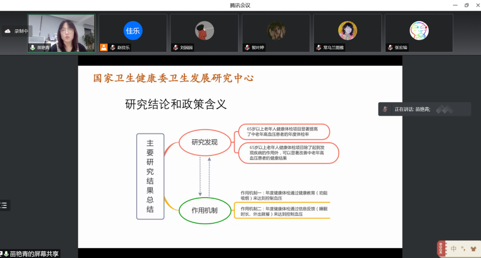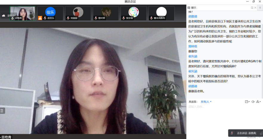 线上讲座气氛热烈,苗主任耐心细致回答了我院师生提出的问题。通过此次讲座,我院师生对医防融合的内涵、医保打包支付在实践中的应用等内容有了一定的了解。为我院今后相关学术研究的开展提供了理论指南。最后,主持人对苗艳青主任的讲座内容进行总结,并感谢苗主任为我院师生带来的精彩讲座,期待未来在学术研究领域能有更加深入的合作交流。