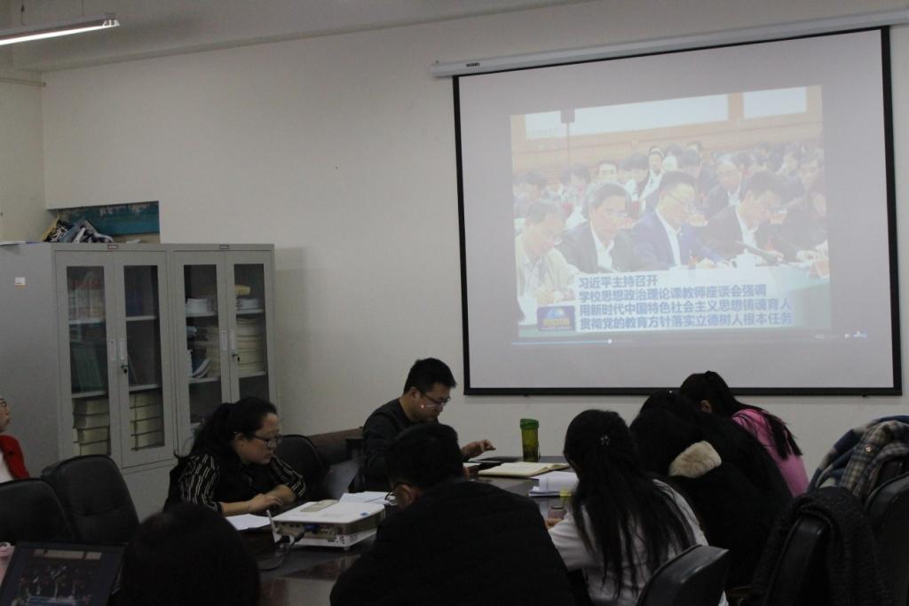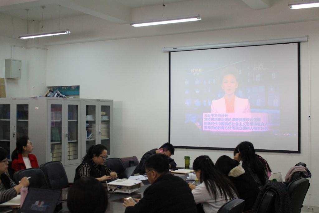 于彩霞纪检委员在会议中宣读了内蒙古自治区委员会宣传部下发的“关于做好学习贯彻学校思想政治理论课教师座谈会精神的通知”并组织观看了新闻联播相关内容,强调了“立德树人”、将思想政治教育与专业课程相结合的教学理念。全体教师认真学习,积极讨论,牢记“立德树人”,将思想政治教育融入课堂,自觉作学生的表率,用高尚的人格感染学生,实现全员育人、全程育人和全方位育人。