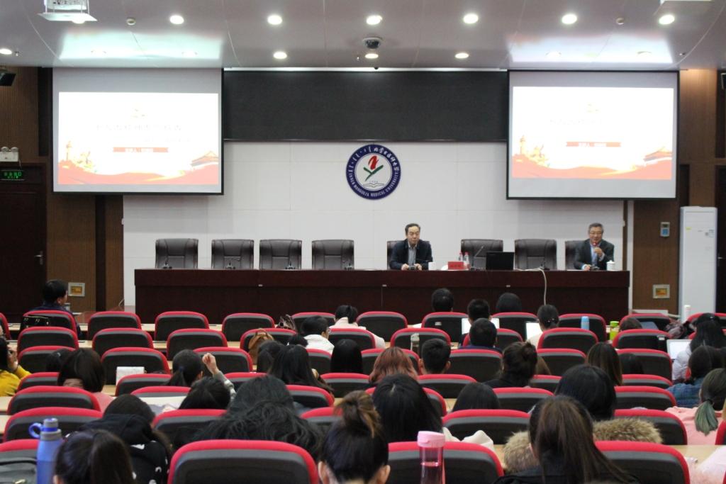 2018年11月22日下午2:30,卫生管理学院和马克思主义学院邀请内蒙古社科联杭栓柱主席在金山校区交流中心为广大师生做了题为“十九大精神报告专题报告——乡村振兴战略解读”的专题讲座。
