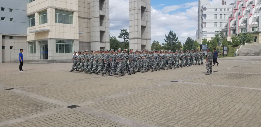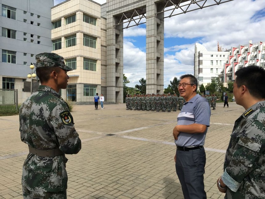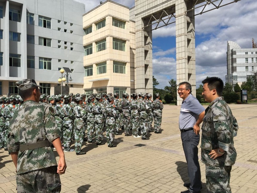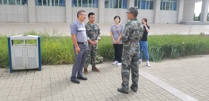 六营十四连教导员(卫生管理学院院长、书记)范艳存于2018年9月3日下午来到军训场地慰问了军训教官及全体参训新生。首先对军训教官的辛苦付出表示了诚挚的谢意,与教官进行了亲切的交流,同时对全体参训学生的坚持不懈与认真训练提出表扬与肯定,并鼓励大家在接下来的日子里再接再厉。范院长强调,军训是新生进入大学的第一项必修课,希望大家认真训练,严格要求自己,服从命令,听从指挥,为以后的大学时光奠定一个良好的基础。