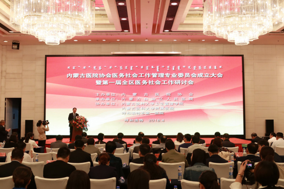 2018年4月21日,内蒙古医院协会医务社会工作管理专业委员会成立大会暨第一届全区医务社会工作研讨会在呼和浩特市隆重召开。本次会议由内蒙古医院协会主办,内蒙古自治区人民医院承办,内蒙古医科大学卫生管理学院、内蒙古医科大学附属医院和呼和浩特市第一医院协办。来自全区各医疗机构、高校的300余名代表参加成立大会,共同商讨全区医务社会工作的发展思路等相关议题。