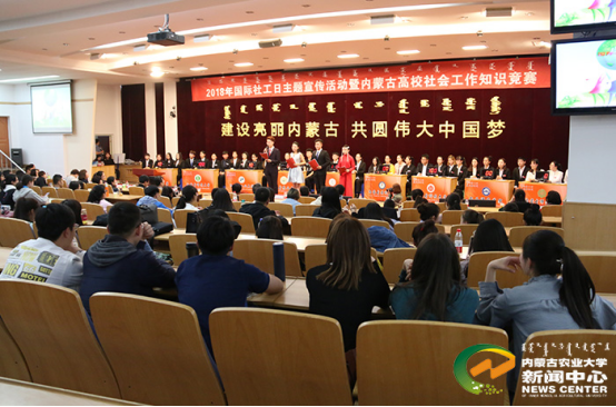 3月25日下午,由自治区社会工作协会主办,内蒙古农业大学、内蒙古工业大学联合承办的2018年国际社工日主题宣传活动暨内蒙古高校社会工作知识竞赛在内蒙古农业大学举行。共有我校与内蒙古大学、内蒙古师范大学、内蒙古工业大学、内蒙古财经大学、内蒙古农业大学、内蒙古科技大学、内蒙古师范大学青年政治学院、包头师范学院等9支代表队共计36人参赛。各高校社工系相关领导担任竞赛评委,各高校师生代表近400人观看了比赛。