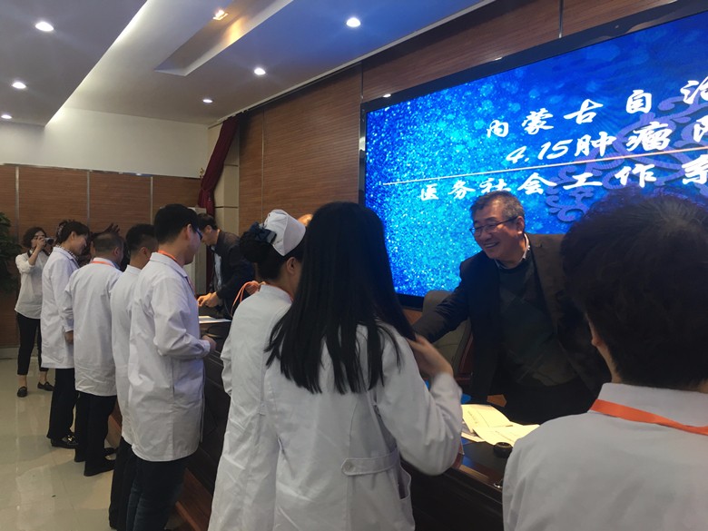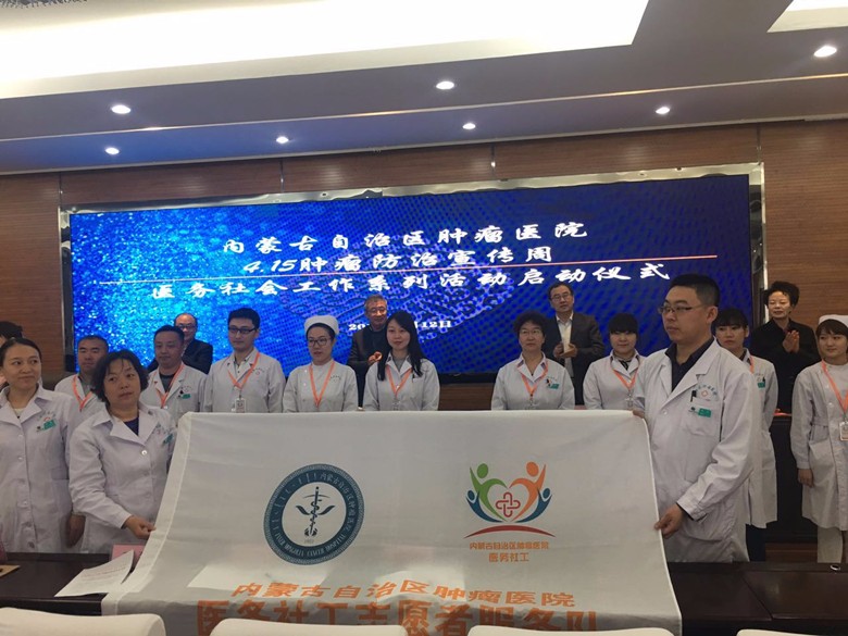 在4月15日肿瘤防治周来临之际,4月12日下午,在附属人民医院后勤保障楼举行医务社会工作系列活动启动仪式。大会由附属人民医院副院长陈新华主持,内蒙古医科大学卫生管理学院院长范艳存教授、附属人民医院党委书记王宏伟同志、卫生管理学院社会医学教研室主任傅海虹、内蒙古癌症预防与康复协会会长云丽珍,以及卫生管理学院社会工作专业教师、医务工作者、志愿者参加本次活动。