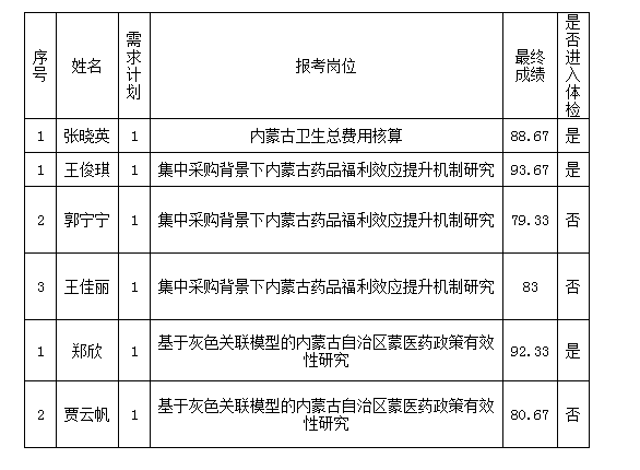 根据《内蒙古医科大学2022年度公开招聘科研助理岗位公告》《内蒙古医科大学2022年度第二轮科研助理岗位招聘公告》,公开招聘工作已完成网上报名、资格审查、面试等环节,现将考试成绩及进入体检和考察范围人选予以公布。