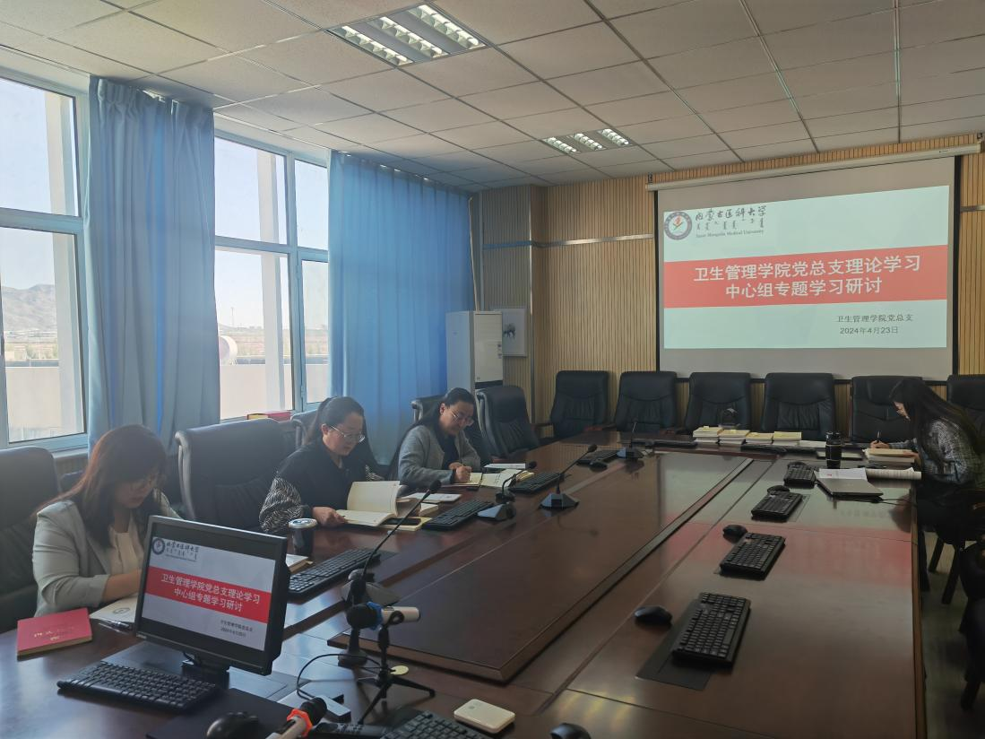 2024年04月23日上午,卫生管理学院党总支理论学习中心组开展专题学习,学院党总支副书记、副院长张楠领学《习近平关于全面从严治党论述摘编》第十一章:坚持从严治党,依规治党,全方位扎紧制度笼子。领学后班子成员进行专题研讨。