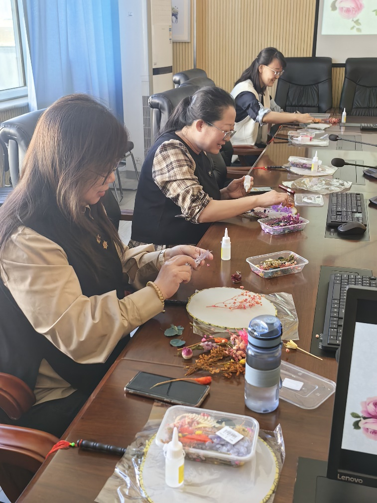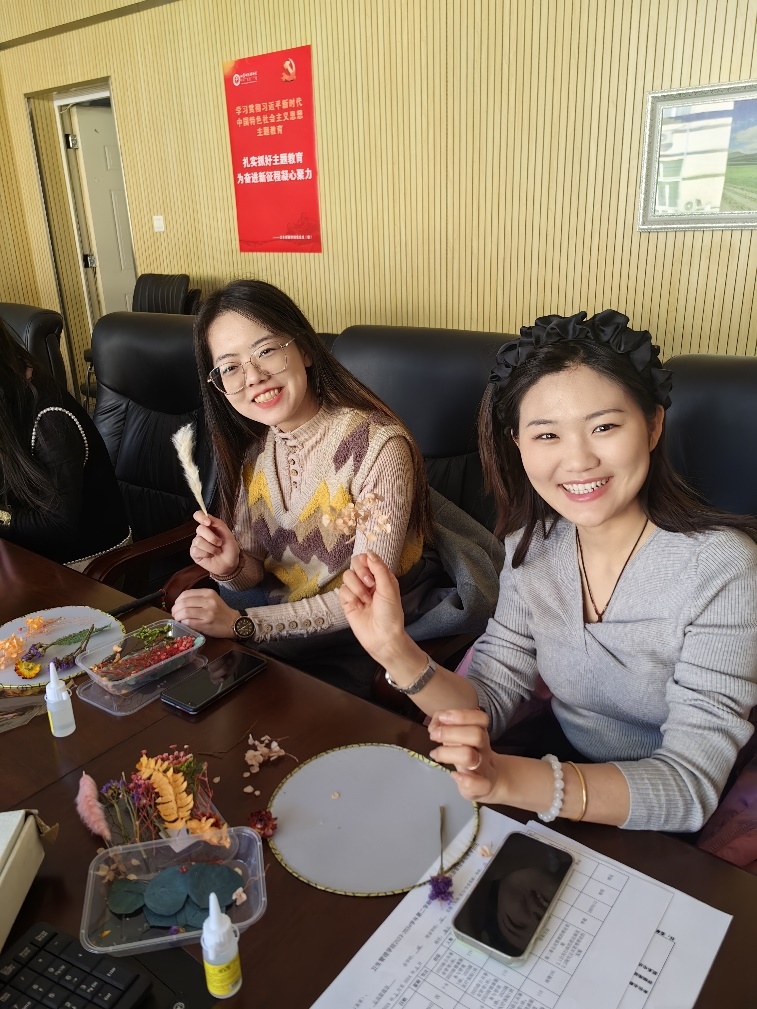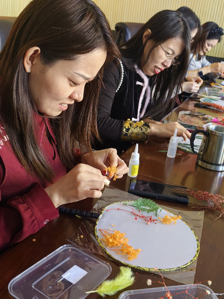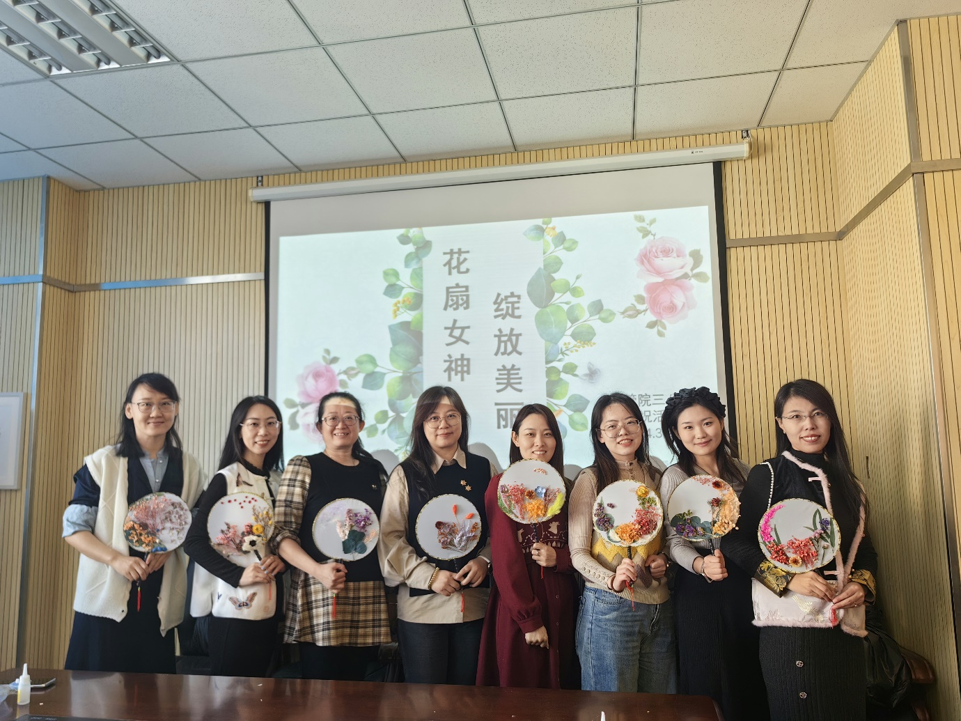人间最美三月天,春花烂漫展新颜。在第114个"三八"国际妇女节来临之际,为弘扬时代精神,展现巾帼风采,3月7日,卫生管理学院工会分会举办了"花扇女神 绽放美丽"三八妇女节创意团扇制作活动。活动中,老师们选择花枝设计造型、搭配色彩、细心修剪,在永生花团扇制作中感悟取舍之道、领会古雅之美,从作品欣赏中获得满足,在相互交流中接近距离,美丽的团扇传递了美好和祝福。这次插花活动丰富了女职工的文化生活,激发了工作的热情,抒发了生活的热爱,展现了优雅的情怀,提升了团队凝聚力,获得了大家的一致好评。大家在作品完成后,相互展示、相互欣赏,举起作品拍照留念,留下美好的瞬间。