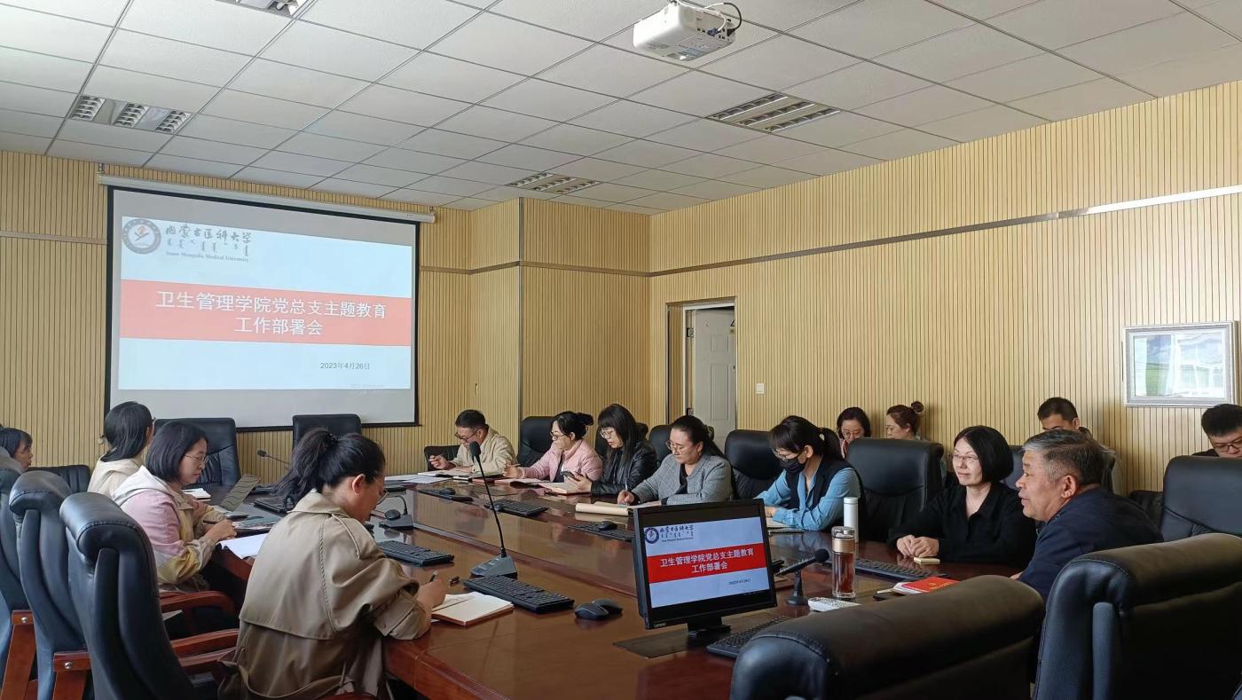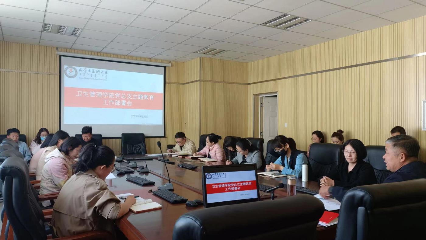2023年4月26日,卫生管理学院在G座5楼会议室召开了深入开展学习贯彻习近平新时代中国特色社会主义思想主题教育工作部署会,全院教职工参加会议,学院党总支书记任孝东指出此次主题教育的重要性,并根据学校统一部署进行了动员和学习工作部署。