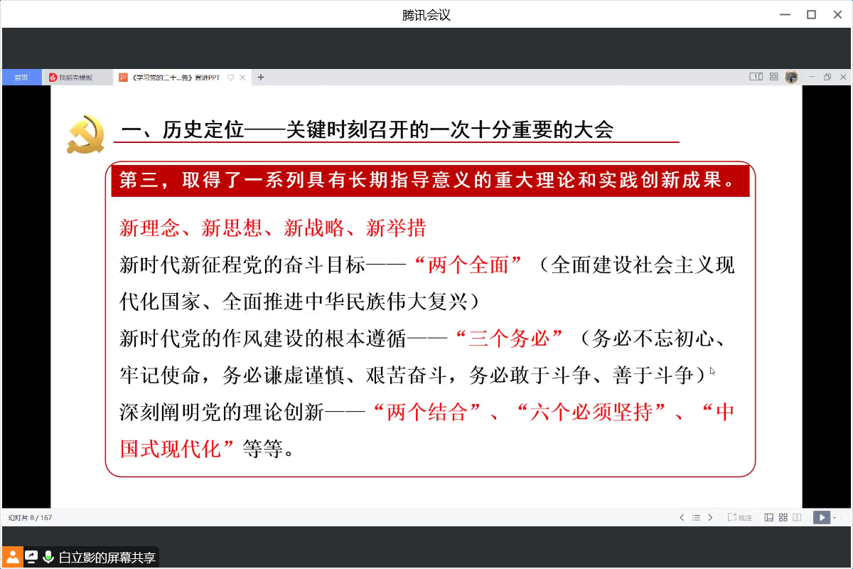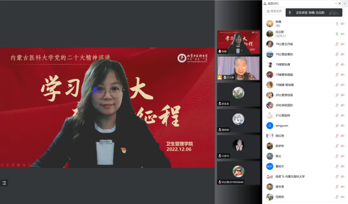 为贯彻落实习近平总书记关于深入学习宣传贯彻党的二十大精神的重要指示精神,按照学校校内巡讲通知要求,12月6日,卫生管理学院党总支以线上形式开展了深入学习宣传贯彻党的二十大精神宣讲活动,由内蒙古医科大学校内巡讲第四组组长白立影教授作专题宣讲,卫生管理学院全体教职工和学生党员100余人参加了讲座。