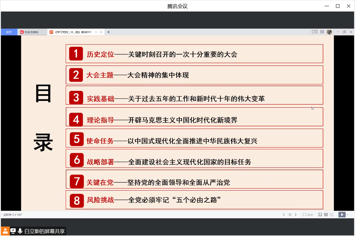 白立影教授以《高举中国特色社会主义伟大旗帜 为全面建设社会主义现代化国家而团结奋斗——学习宣传贯彻党的二十大精神》为主题,作党的二十大精神理论宣讲。从党的二十大的历史定位、大会主题、实践基础、理论指导、理论指导、使命任务、战略部署、关键在党、风险挑战八个方面深入阐释了党的二十大的核心要义,学习领悟过去五年工作和新时代十年伟大变革的重大意义,学习开辟马克思主义中国化时代化新境界的重要思想,学习新时代新征程中国共产党的使命任务。