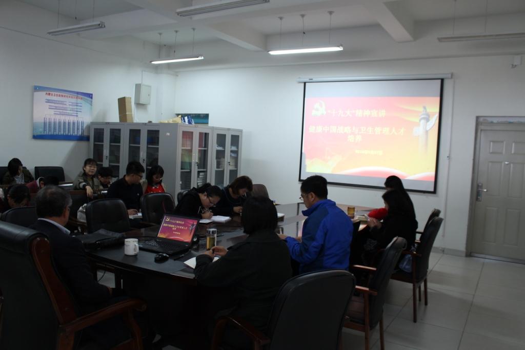 2018年9月27日下午14时,卫生管理学院党总支组织全体党员于研究所会议室由范艳存书记进行“十九大”精神宣讲--健康中国战略与卫生管理人才培养。宣讲内容主要分为健康中国2030规划,互联网+ 公共管理人才培养和大数据下的行政管理本科培养。