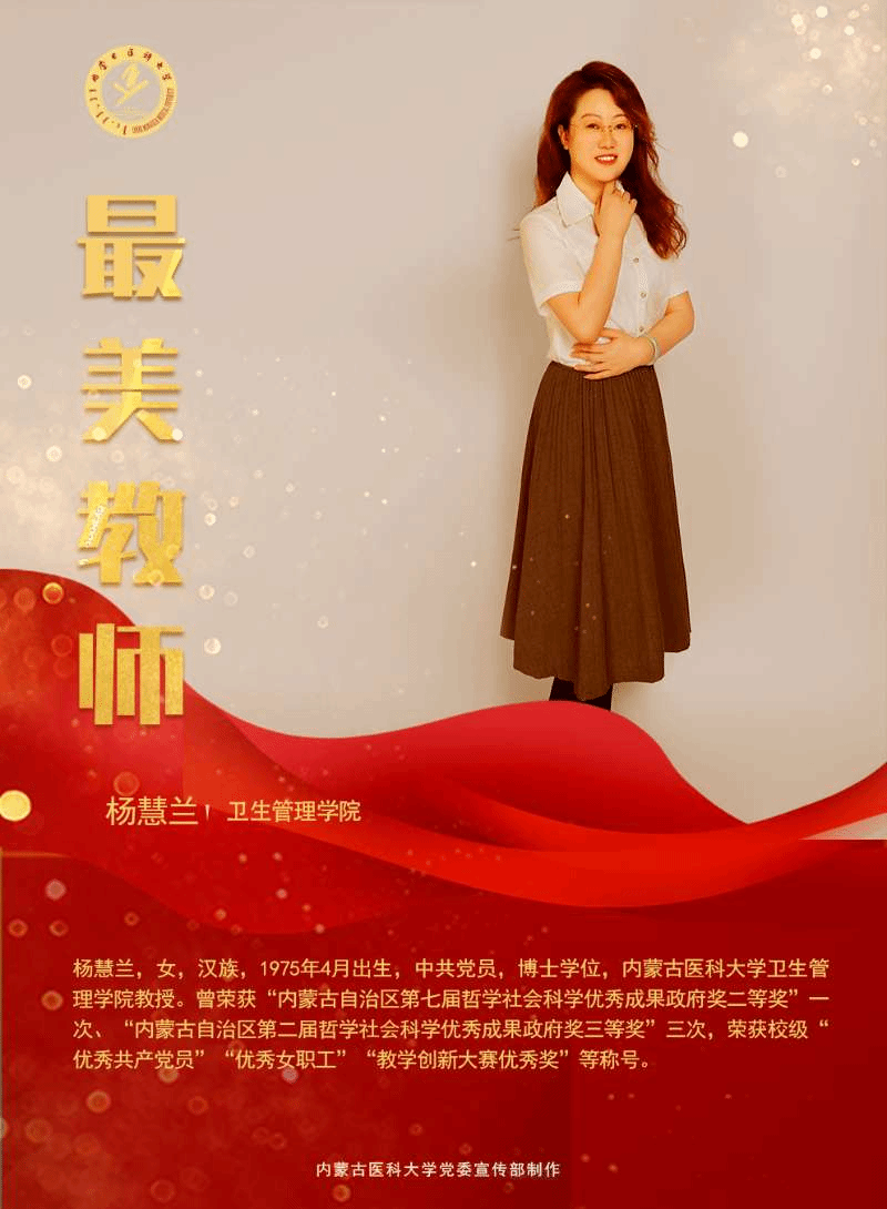杨慧兰老师始终扎根教学一线,从青年教师到学科骨干,主讲多门核心课程,以扎实的理论功底和生动的教学风格向学生传道授业解惑。她主持教育部产学合作协同育人项目,大胆地将“三明治”教学法融入专业课。在课堂上,她巧妙地将理论知识与实际案例相结合,让学生们在角色扮演和项目实践中深入理解专业知识,极大地提升了课程的实操性。凭借对教学的深入钻研和不懈探索,她收获了多项荣誉:2025年内蒙古医科大学第四届教师教学创新大赛优秀奖、2005年青年教师课堂教学技能大赛二等奖……荣誉背后,是她对课堂品质永无止境的追求。她注重培养学生的实践和创新能力,在她的悉心指导下,学生们在各类竞赛中屡获佳绩——2024年内蒙古医科大学MPA案例大赛一等奖、“以例促学,畅通管理”卫生管理学院本科生管理案例大赛三等奖。